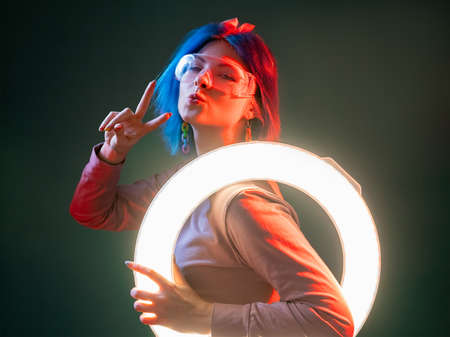 Neon light model. Techno style. Futuristic illumination. Flirty cute woman pouts lips with LED round flash lamp in red glow isolated on dark background.