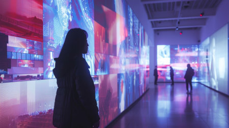 A person stands in front of a stunning red digital display in an art gallery at dusk.
