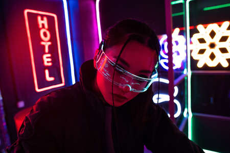 Vertical closeup portrait of young Asian woman wearing cyberpunk style sunglasses in futuristic set