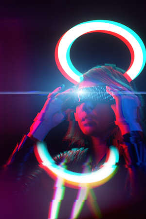 From above young female in futuristic glasses touching head and looking away under colorful neon illumination