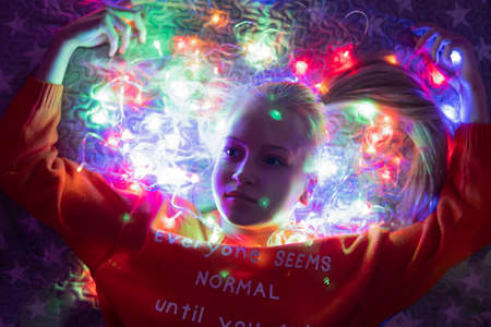 Portrait of young girl that is in eyeglasses in blue neon lighting