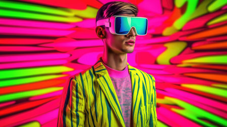 Young male model wearing VR posing with trendy fashion outfit and colorful vibrant glowing lime green optical art abstract background. Picturesque generative AI