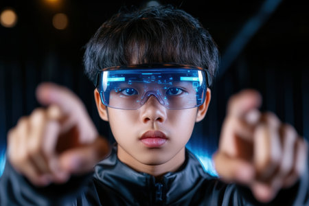 Virtual technologies of the future. A teen boy in a black hoodie and goggles smiles insidiously looking at holographic data on virtual screen in front of him. Neon lights. Teen hacker in cyberspace.