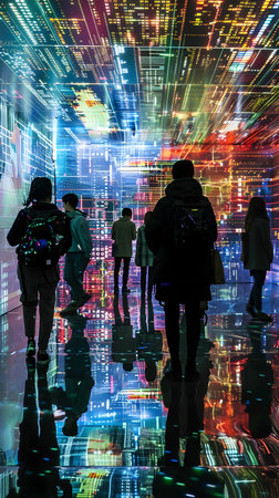 People exploring interactive digital art exhibition with vibrant lights and reflections creating immersive atmosphere