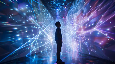 A person stands surrounded by colorful swirling lines and abstract shapes, engaged in a mesmerizing exploration of perception and creativity.