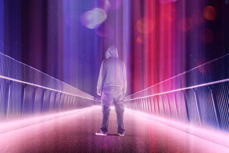 A mysterious hooded figure standing in the middle of a path at night. Silhouetted against bright lights. Overlayered with a neon, retro, vapor wave edit.