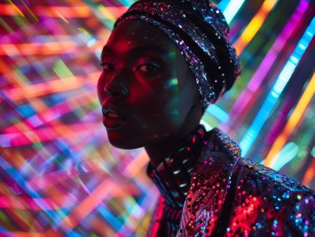 Positive young woman disco neon lines dispensing fashion studio model unaltered