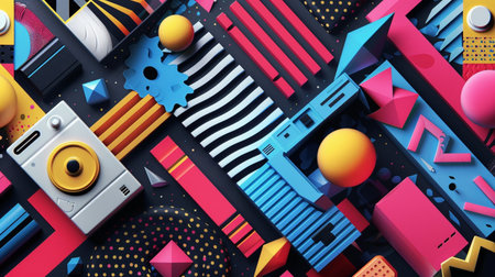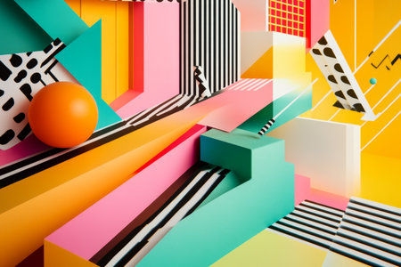 Dynamic representation of geometric elements in the style of 80s Memphis design. The composition embraces the retro aesthetic with bold shapes, vibrant colors, and playful patterns, capturing the essence of the iconic 80s visual language. --ar 3:2 --style raw --stylize 280 Job ID: 2044af39-bffa-4643-9cd6-1d31d6870b96