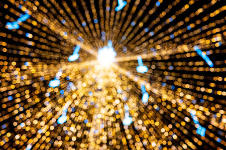 Abstract golden bokeh light tunnel with radiating, defocused festive lights. A warm, glowing background perfect for holiday, Christmas, celebration, and decorative design projects.