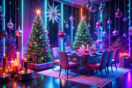 A brightly lit room with a Christmas tree and a table with a lit candle. The room is decorated with colorful lights and ornaments, creating a festive and lively atmosphere