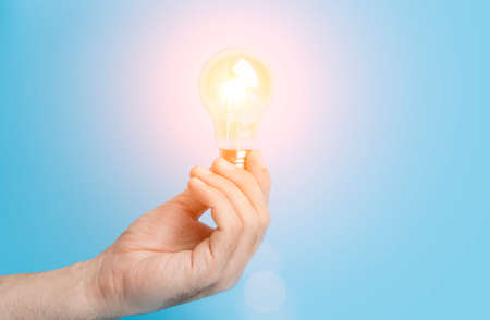 Knowledge and concept. Light bulb with light in hand on a blank blue background. Brain, wisdom, knowledge and energy conservation is a creative idea. high quality photo