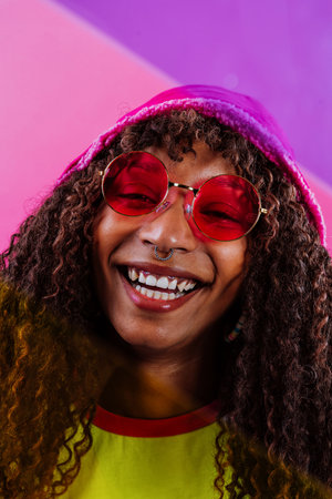 Studio portrait of a cheerful young woman with curly hair, wearing a pink beanie and sunglasses, smiling against a vibrant, colorful background with geometric shapes