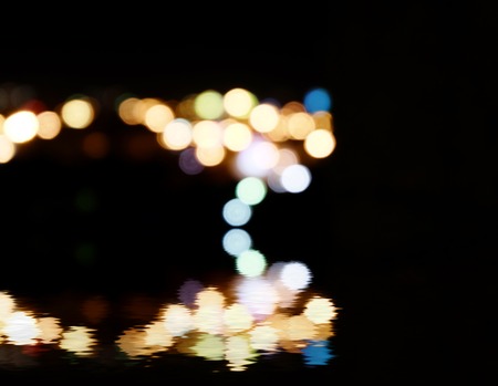 A night scene showing colorful bokeh lights reflecting on water, creating vibrant abstract
