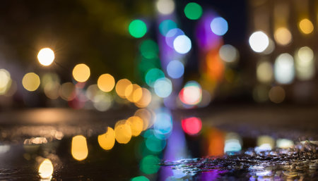 A mesmerizing display of vibrant, out-of-focus lights reflecting on a dark, still surface, creating a beautiful bokeh effect and a sense of festive ambiance.