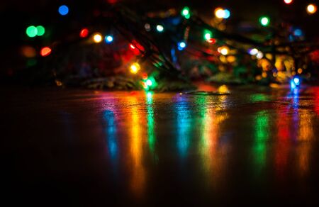 Christmas lights glowing. Xmas holiday decoration background, banner. Colorful lights garland illuminated, reflections on the wood floor, copy space, banner