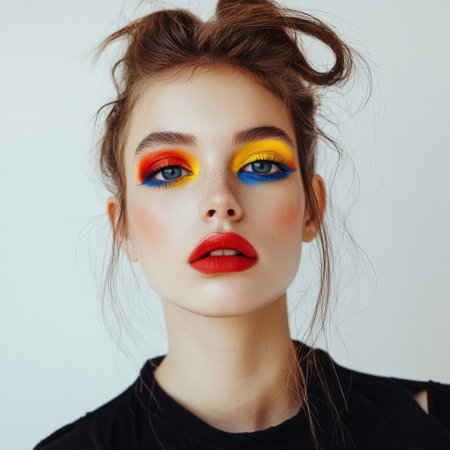 A fashion model displays captivating makeup featuring bright colors and unique highlights. The model's hairstyle complements the artistic look, set against a bold background.