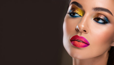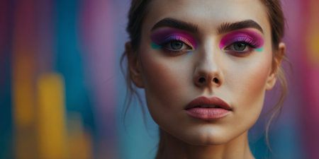 A stunning portrait showcasing vibrant beauty makeup with bold colors. The model's expressive eyes and glossy lips highlight contemporary fashion trends.