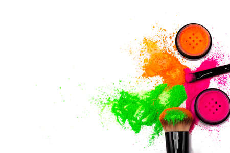 Cheek brush with neon cosmetic powder colorful pile and isolated on white background