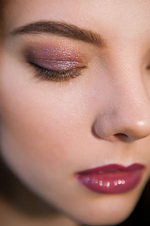 Vertical close-up of woman with bright makeup in mauve colors with eyes closed. Nude visage with perfect eyebrow shape and sparkle eyeshadow pigment