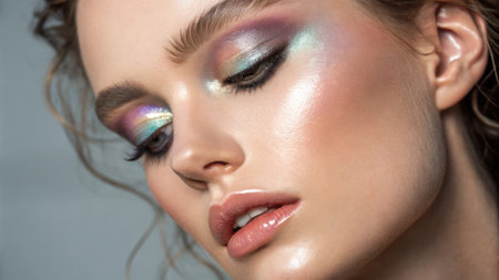 An artistic closeup of a person whose makeup features a blend of pearlescent hues on their eyelids creating a mesmerizing reflection of colors. Their glossy lips glimmer softly and.