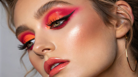 A closeup of a person with artistic eye makeup that combines neon red and peach hues in an ombre fashion. Bright lighting reflects off their lashes adding a mesmerizing sparkle.