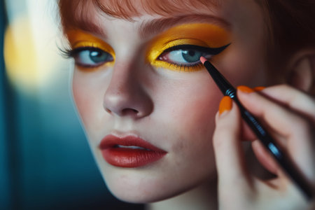 Makeup artist's hand applying eyeliner on a model with vibrant yellow eyeshadow, creating a bold and fashionable look