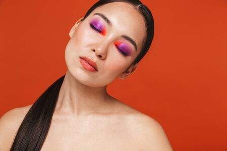 Beauty portrait of an attractive young topless asian woman with brunette hair wearing bright makeup, standing isolated over red background, eyes closed, posing