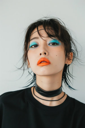 Asian woman with colorful makeup in black tshirt beauty and fashion concept