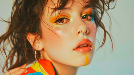 AI Generated. Close-up, Pretty face of a beautiful woman with multi colors vivid makeup on minimal background