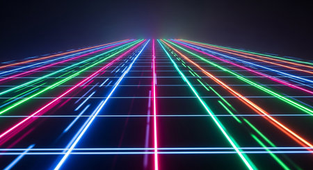 This vibrant neon fiber optic lines abstract texture background features dynamic speed lines and modern high-tech patterns, ideal for futuristic design projects, technology themes, or digital