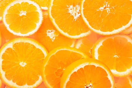 Top view of a several orange fruit slices on bright background in orange color. A saturated citrus texture image