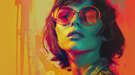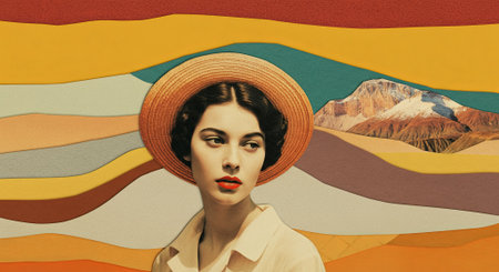 Vintage elegance meets modern art in a surreal collage, where a poised woman in a hat blends seamlessly into colorful abstract landscapes. Generated A.I.