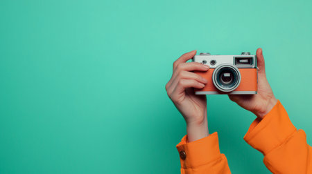 A creative image showing hands holding an old-fashioned camera with a turquoise and coral abstract backdrop. Ideal for artistic or retro photography themes.
