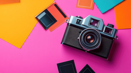 A vintage film camera rests on a bold pink background, accompanied by colorful photographic slides and bright paper, creating a nostalgic and artistic scene.