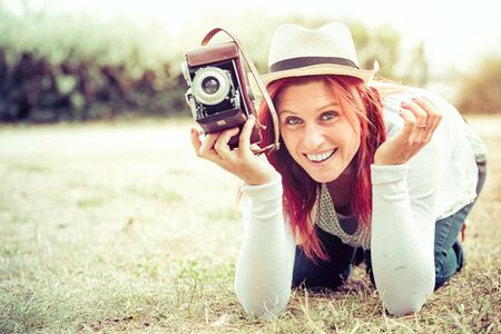 Portrait in the nature of a beautiful smiling red-haired woman using an old camera. Vintage treatment