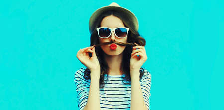 Portrait of funny young woman showing mustache her hair blowing lips with red lipstick sending air kiss on colorful blue background