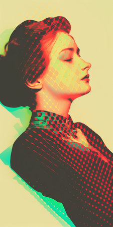 a minimalist portrait of a 1890s starlet sunbathing, featuring a light faded orthonormal coordinate system of 8-bit dots and colors. the op art style is enhanced by a vanished light lithography background and light halftone dots. the composition creates an ever-moving anaglyphic kaleidoscopic aesthetic, resulting in a mesmerizing minimal psychedelic art piece. ai generated