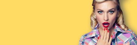 Unbelievable! Excited surprised woman. Pin up adorable girl keeping hand near open mouth. Retro fashion and vintage picture. Yellow background. Copy space for some slogan or sign text.