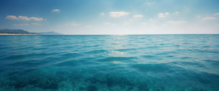 A stunning view of clear ocean water with shimmering sunlight creating sparkles on gentle waves. Perfect for showcasing summer beach vibes and tranquil nature scenes.