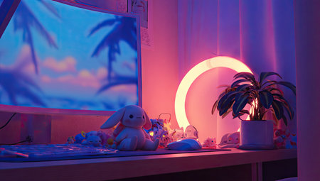 A well-lit indoor scene showcases a desktop setup with a monitor displaying an image. The warm and cool hues create a tranquil atmosphere. A round light and potted plants add visual interest. This image is suitable for various commercial purposes, including website design and editorial content.