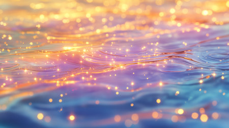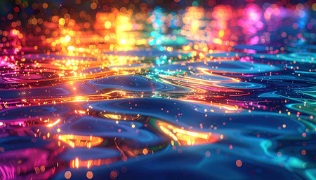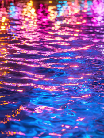 Captivating image showcasing a tranquil water surface illuminated by colorful lights, creating a mesmerizing bokeh effect with gentle ripples.