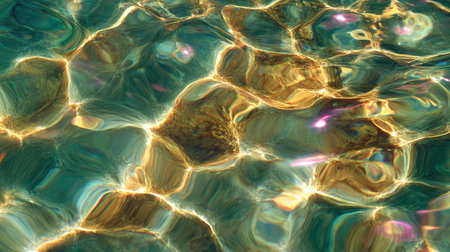 This stunning image captures the mesmerizing play of sunlight on tranquil aqua waters, revealing shimmering gold and turquoise hues. Perfect for serene themes.