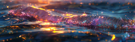 A fluid, abstract surface illuminated by vibrant neon light reflections and scattered sparkling particles.