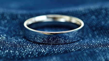 This close-up image features an elegant simple wedding band resting on soft blue fabric. The reflective surface highlights the ring's design, symbolizing love and commitment.