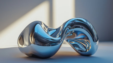 A contemporary metallic sculpture features smooth, flowing curves that reflect light beautifully, creating an interesting visual effect in the indoor setting.