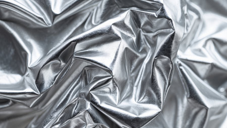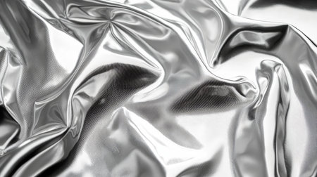 Close-up of shiny silver metallic fabric with glossy folds and smooth textures, creating a luxurious and futuristic appearance.