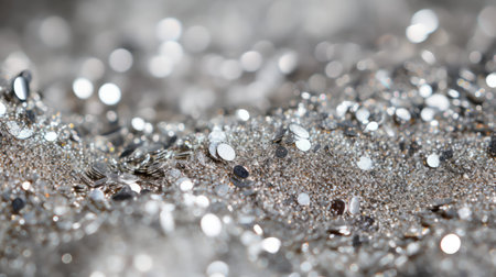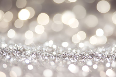This shimmering silver glitter background showcases an enchanting bokeh effect, perfect for adding a touch of elegance and celebration to any design project.