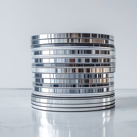 A tall stack of shiny silver and black discs is presented on a reflective white surface against a bright, clean background.