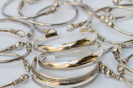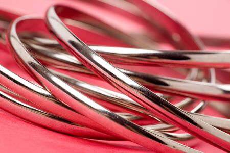 Macro image, Pile of old silver bangles, handmade, on a white Background.