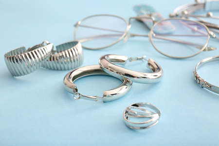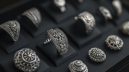 An elegant arrangement of silver jewelry showcasing intricate designs, featuring rings and bracelets, perfect for artistic, fashion, and product photography.